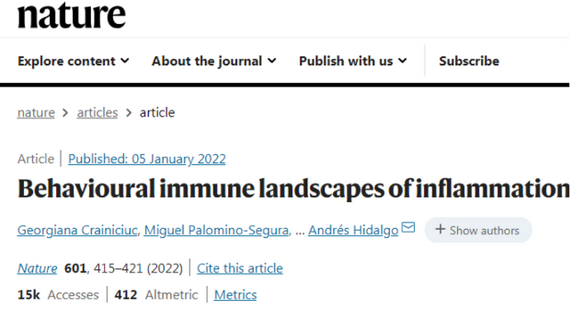近日,研究人員在《Nature》上發(fā)表最新研究,標(biāo)題為:“Behavioural immune landscapes of inflammation"。